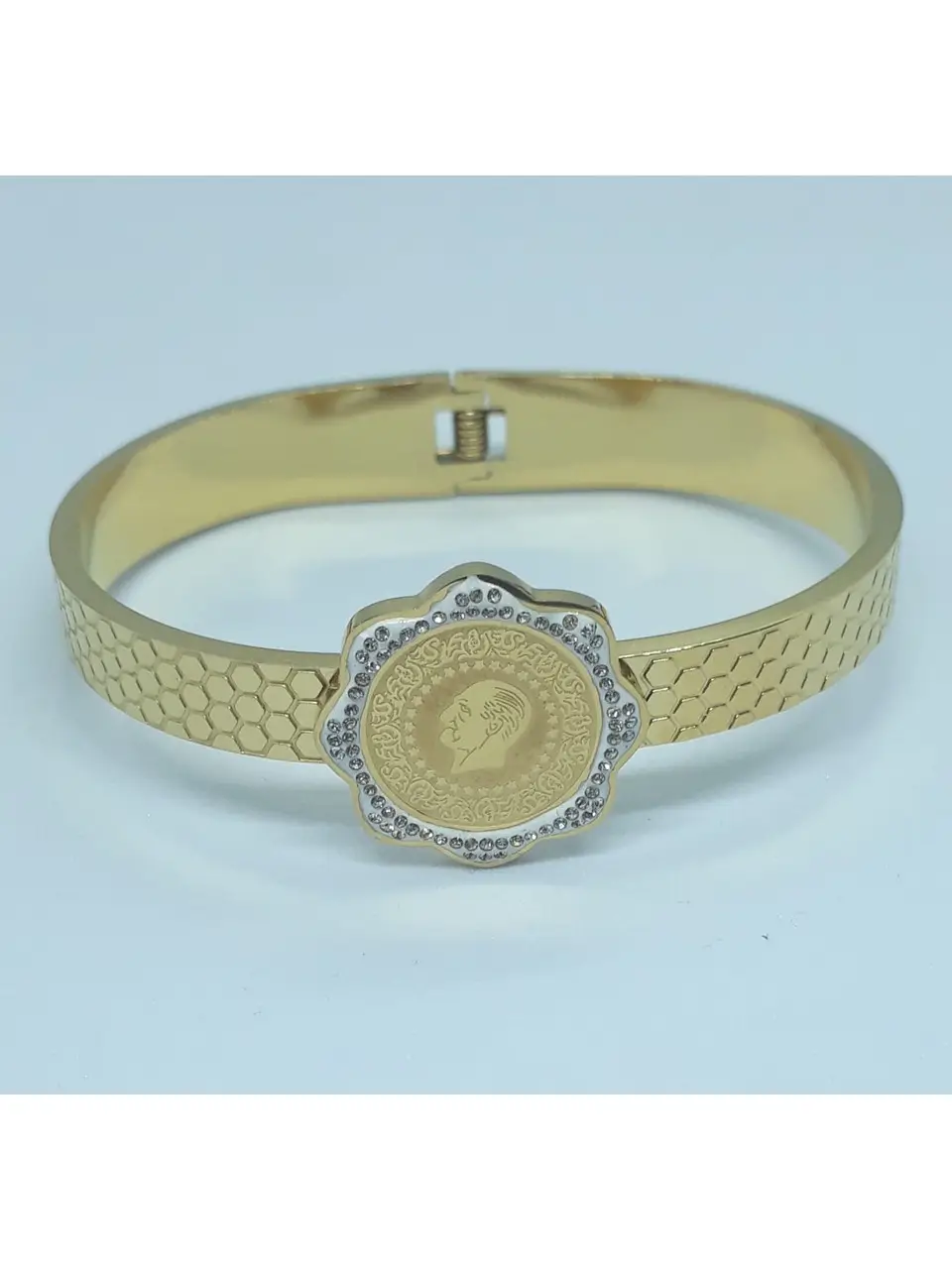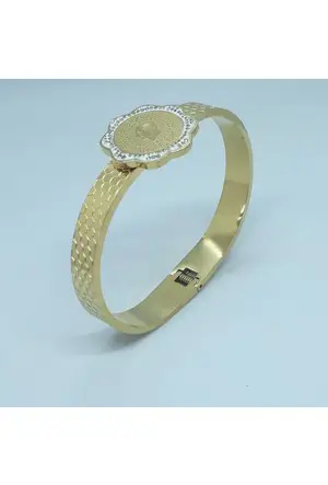 Κάνε κάθε σου εμφάνιση να ξεχωρίζει με αυτό το εκθαμβωτικό γυναικείο ατσάλινο βραχιόλι! Σε λαμπερό χρυσό χρώμα και με στρογγυλό σχέδιο, διακοσμείται περιμετρικά με αστραφτερές ασημένιες πέτρες, που χαρίζουν εκλεπτυσμένη λάμψη και θηλυκή φινέτσα.