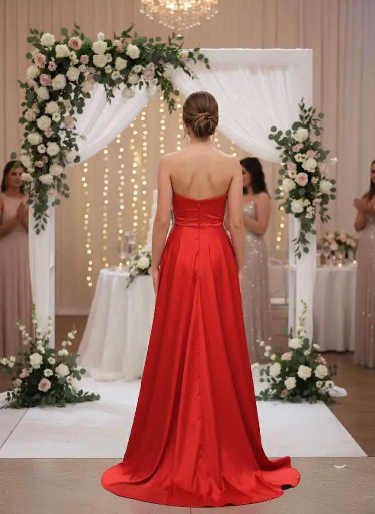 Αν θέλετε να τραβήξετε όλα τα βλέμματα σε έναν γάμο, βάφτιση ή επίσημη βραδινή έξοδο, αυτό το κόκκινο σατέν φόρεμα είναι η απόλυτη επιλογή! Με strapless κόψιμο, διακοσμητικές πέτρες και πλούσια ουρά, προσφέρει μια εντυπωσιακή, αριστοκρατική εμφάνιση που δεν περνά απαρατήρητη.