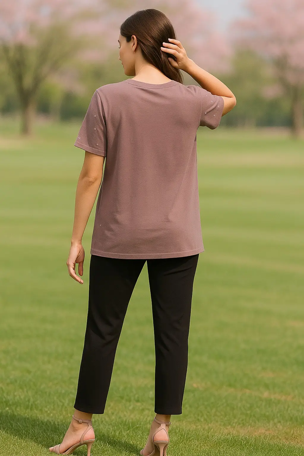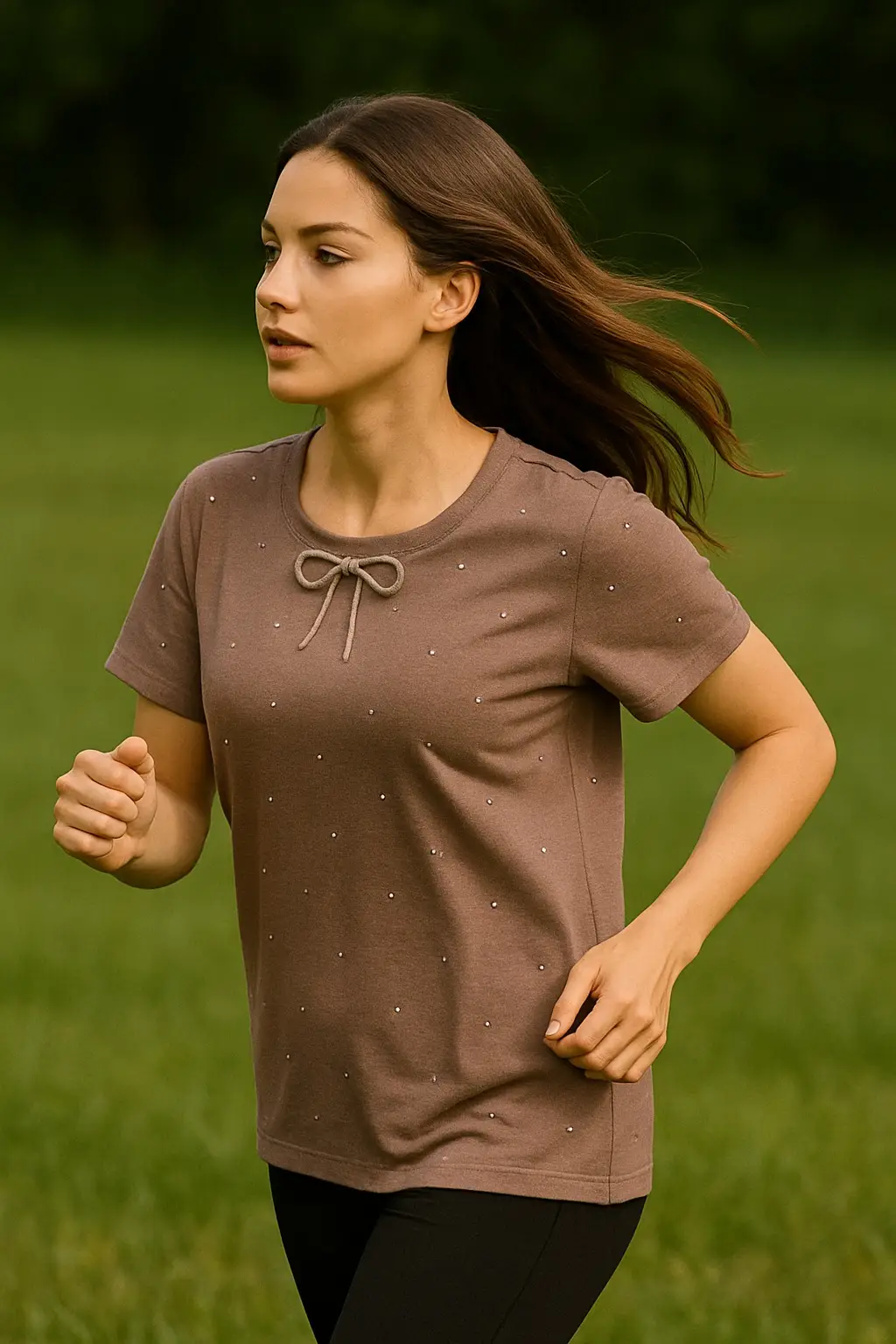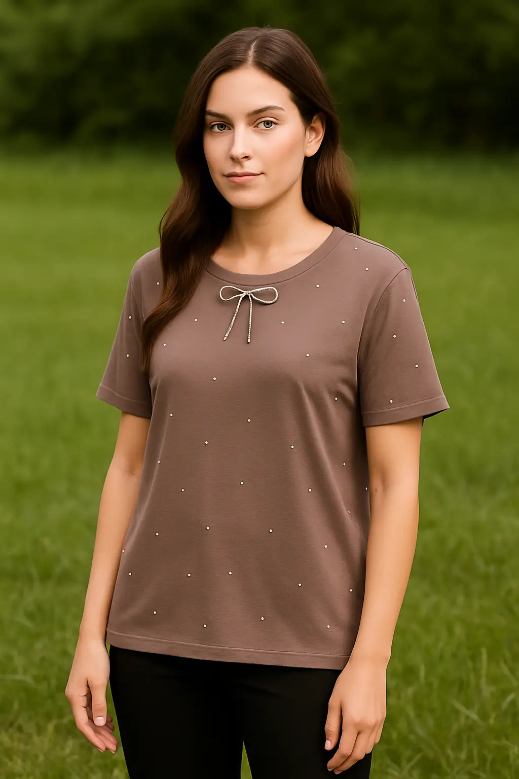 🤎 Γυναικεία Μπλούζα σε Σκούρο Καφέ με Πέτρες & Καρφίτσα | 100% Βαμβάκι