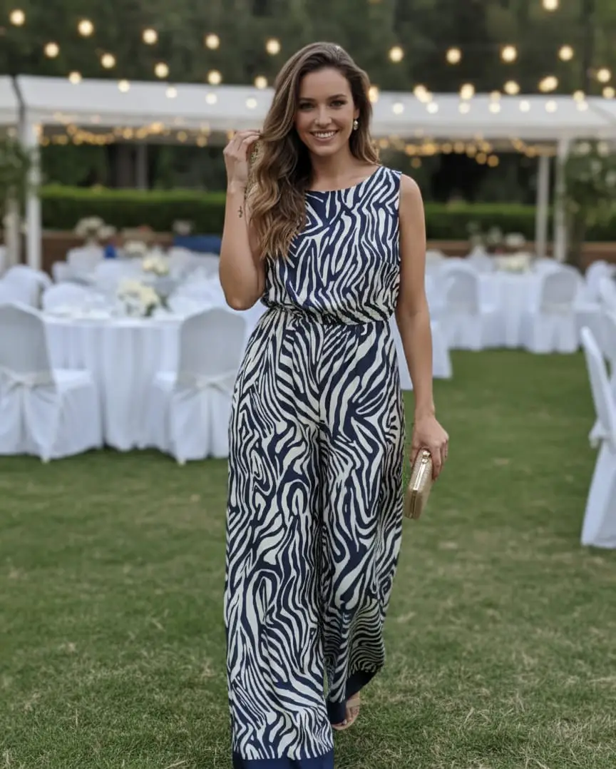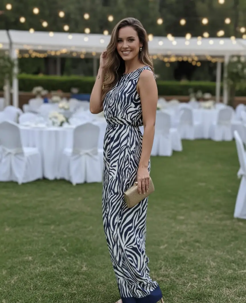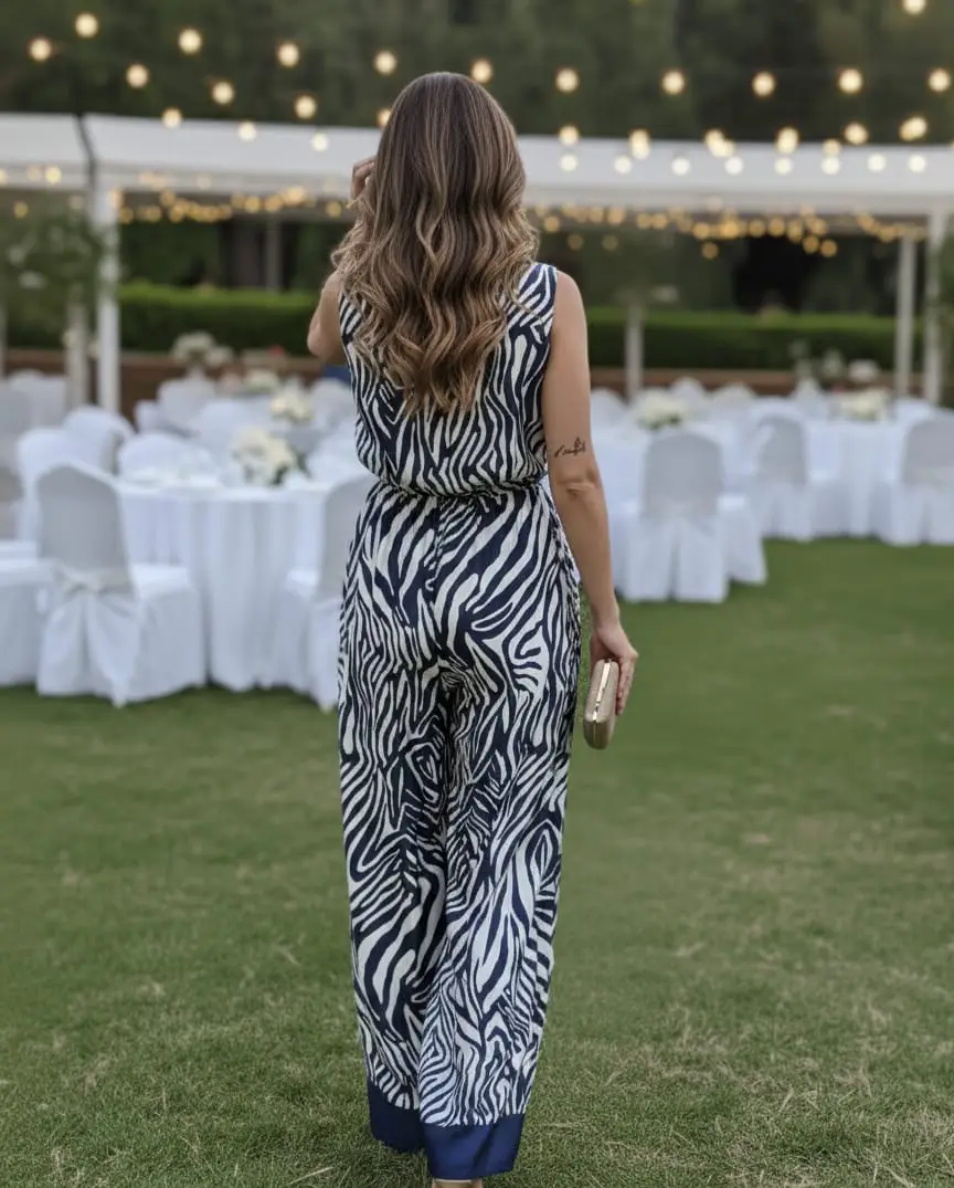 Κάνε statement με τη μοναδική γυναικεία ολόσωμη φόρμα σε zebra print, σε εκρού και μπλε σκούρες αποχρώσεις. Με σικάτο σατέν ύφασμα, αμάνικη γραμμή και διακριτική διακόσμηση στο τελείωμα, είναι η ιδανική επιλογή για γάμους, βαφτίσεις, επίσημα καλέσματα, αλλά και για εμφανίσεις στο γραφείο ή τη βόλτα.