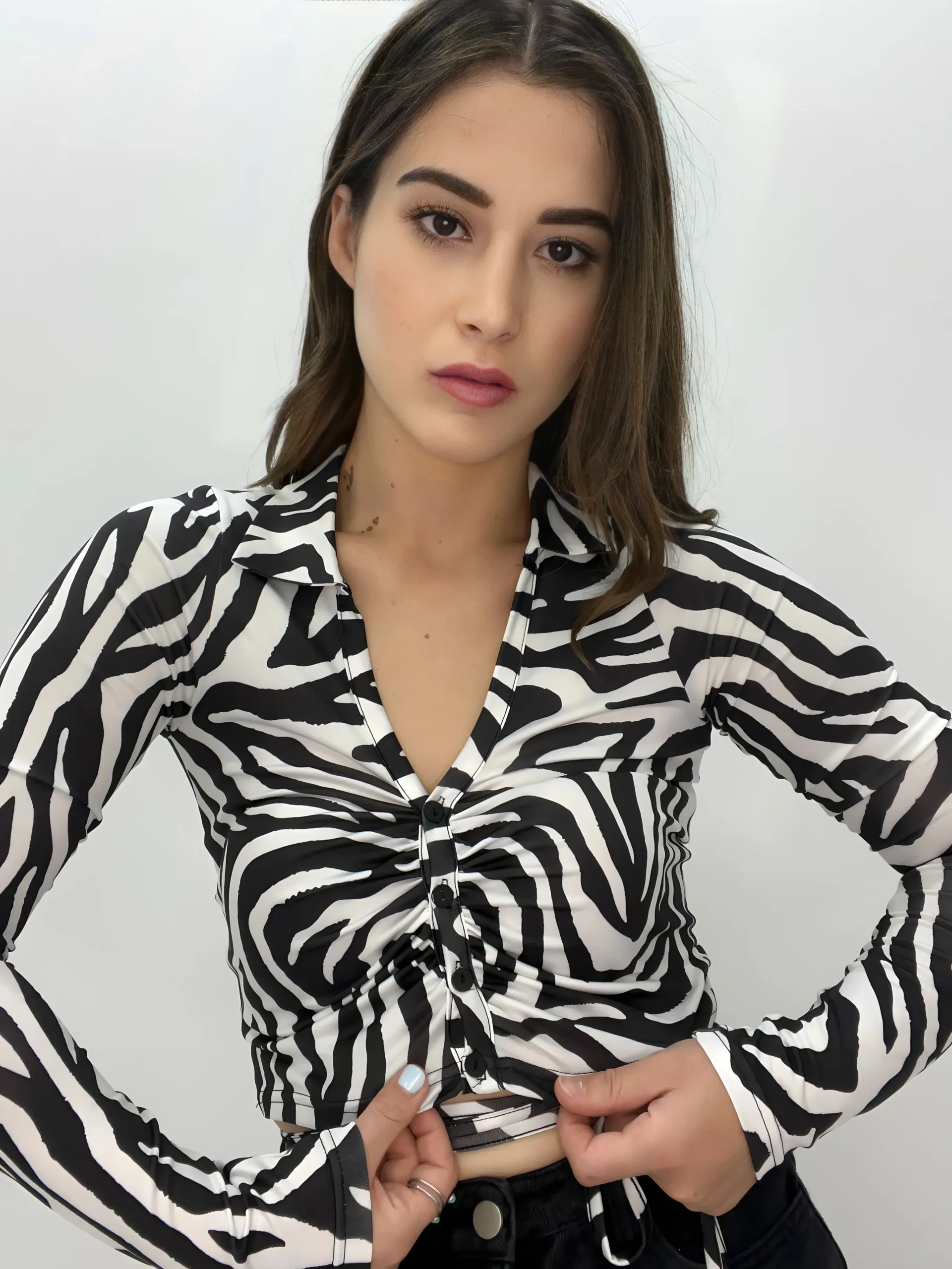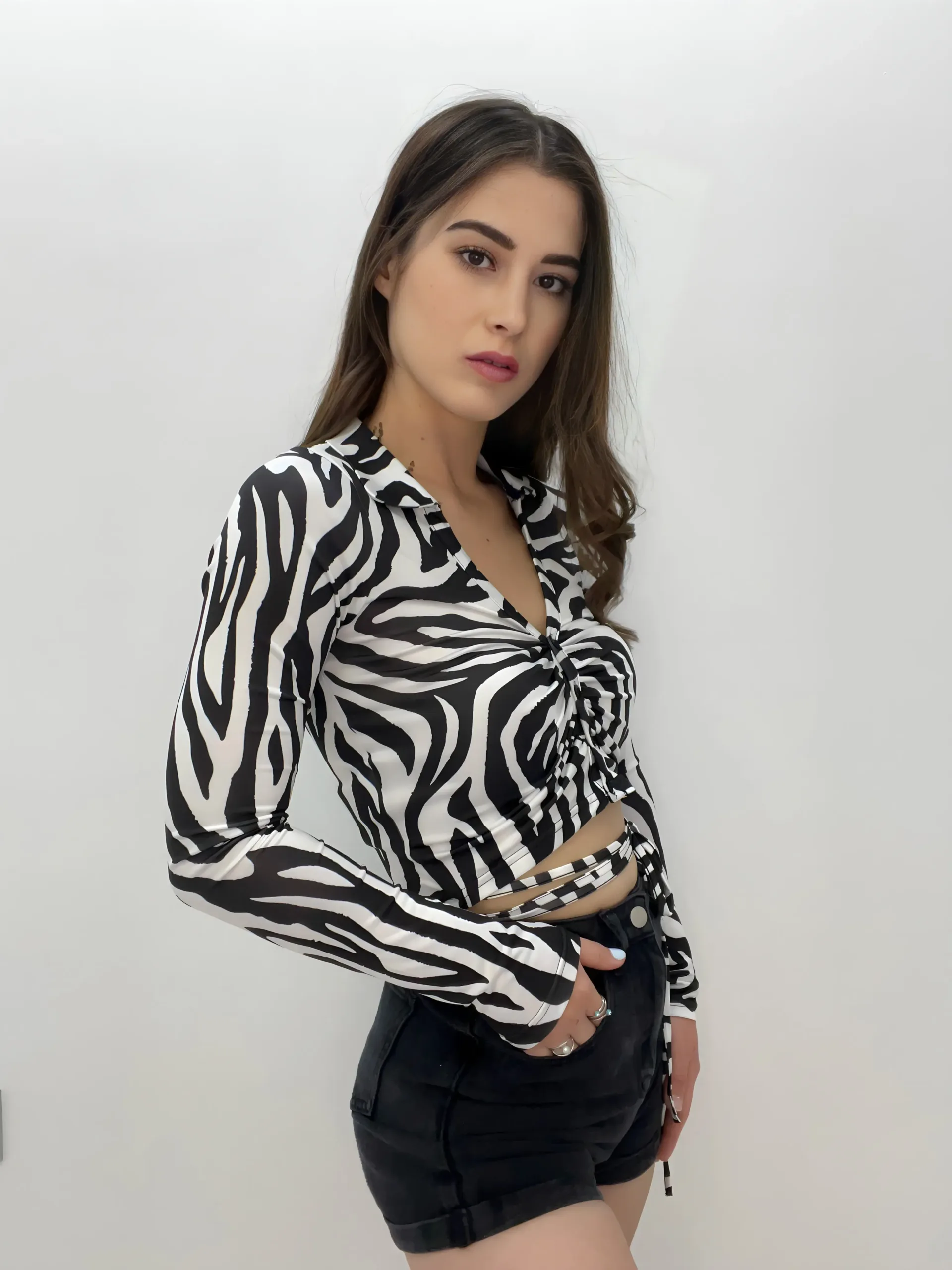 Αφεθείτε στην άγρια γοητεία: Η μπλούζα Zebra με δέσιμο στη μέση ξεχωρίζει με το εντυπωσιακό μοτίβο ζέβρας, σε μια εκκεντρική πρόταση που αποπνέει ένταση και ζωντάνια. Το ασπρόμαυρο ριγέ μοτίβο δημιουργεί μια σαγηνευτική αντίθεση, μεταμορφώνοντας την εμφάνισή σας σε ένα τολμηρό statement στον χώρο της μόδας.