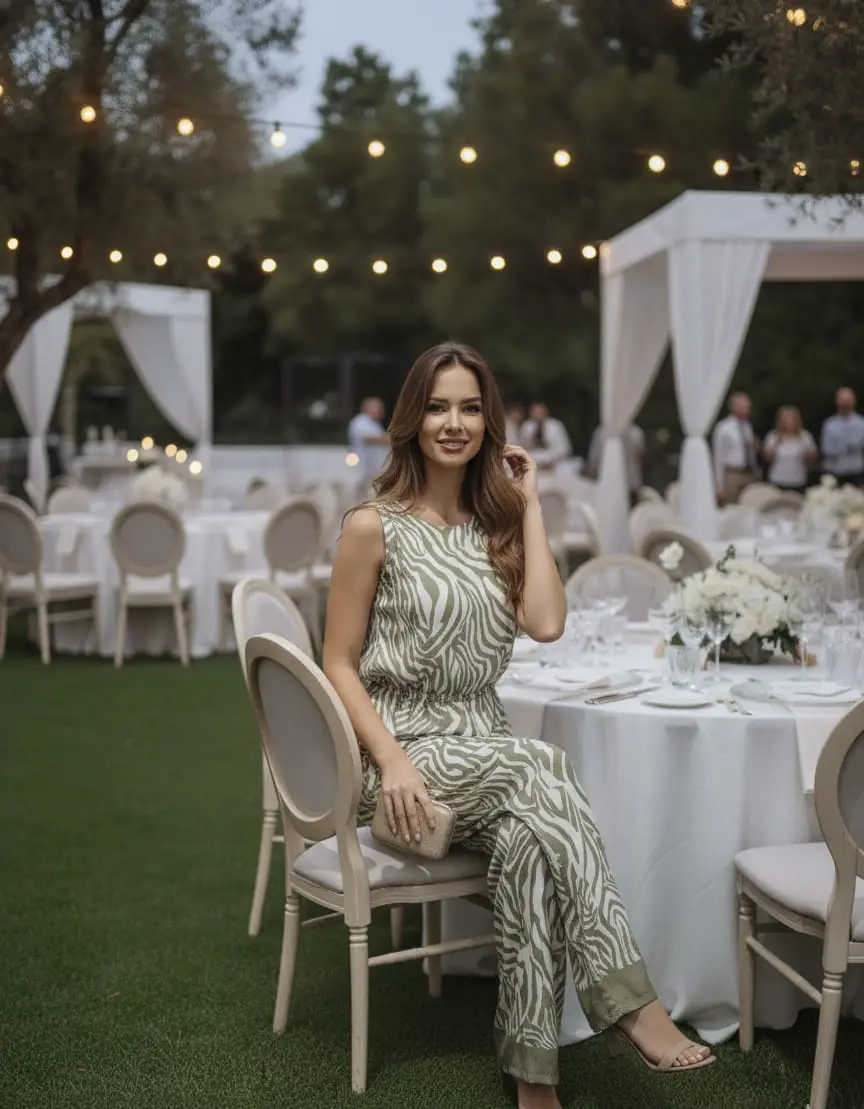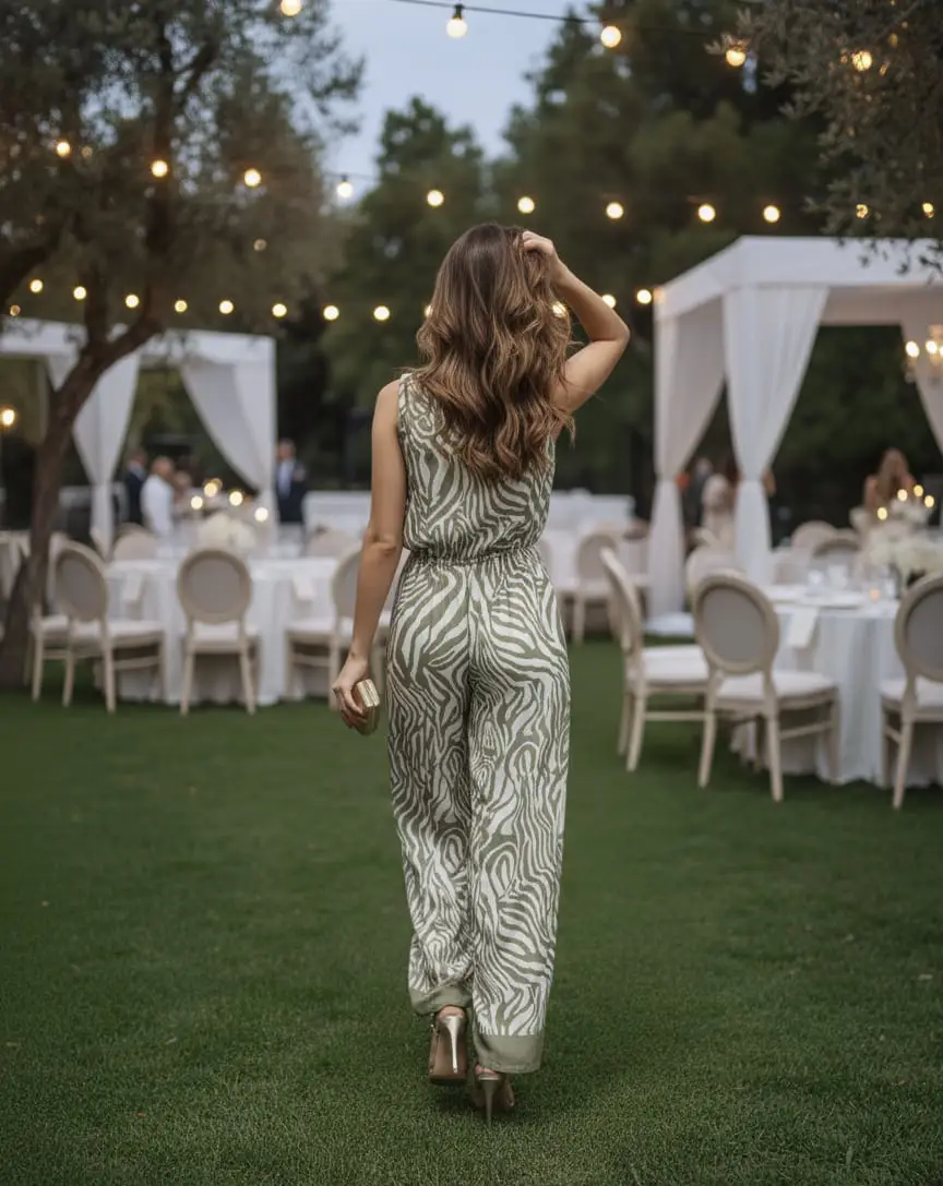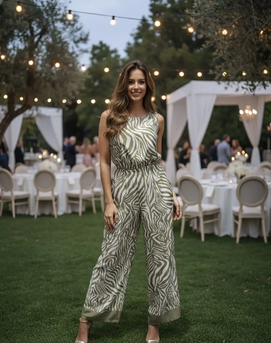 Κομψή και ξεχωριστή, αυτή η ολόσωμη φόρμα σε εκρού και ανοιχτό πράσινο zebra print προσφέρει statement στυλ και απόλυτη άνεση. Το σατέν ύφασμα προσθέτει λάμψη, ενώ η αμάνικη γραμμή και οι λεπτομέρειες στο τελείωμα ενισχύουν τη φινέτσα του ρούχου.