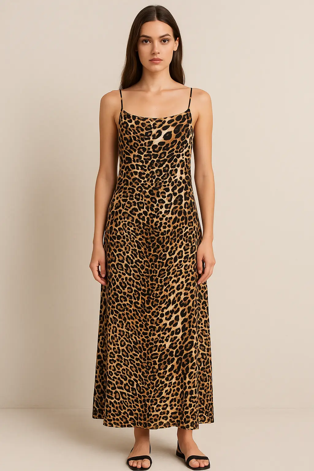 Μακρύ γυναικείο φόρεμα σε εντυπωσιακό λεοπάρ σχέδιο, από δροσερό λινό ύφασμα, σε κανονική γραμμή. Διαθέτει ρυθμιζόμενες τιράντες και λάστιχο στην πλάτη, για άνετη και σταθερή εφαρμογή. Το σχέδιο αγκαλιάζει το σώμα χωρίς να πιέζει και προσφέρει ελευθερία κινήσεων.