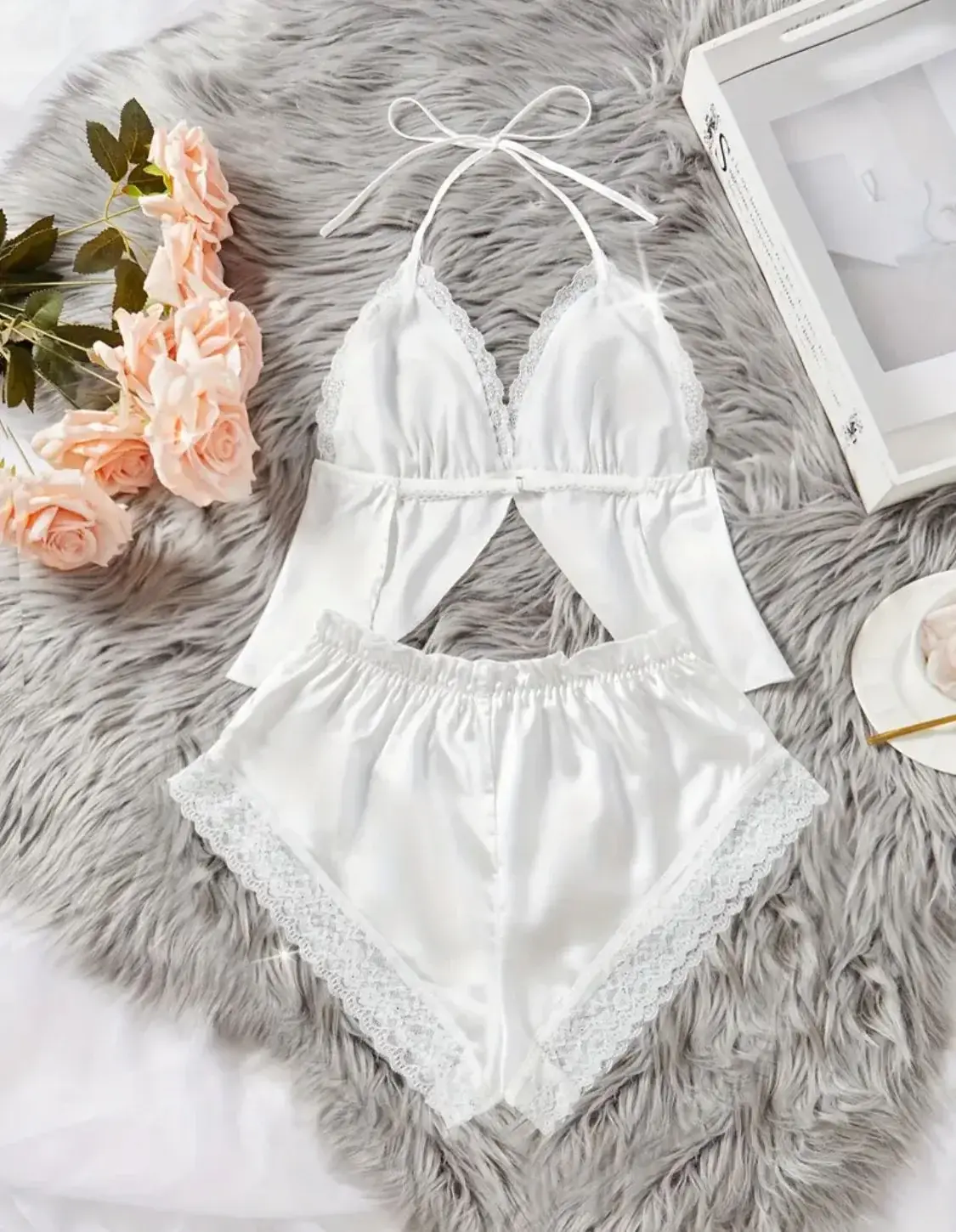 Γυναικείο λευκό σατέν σετ VISATIN – μπλούζα με τιράντες & σορτσάκι με δαντέλα