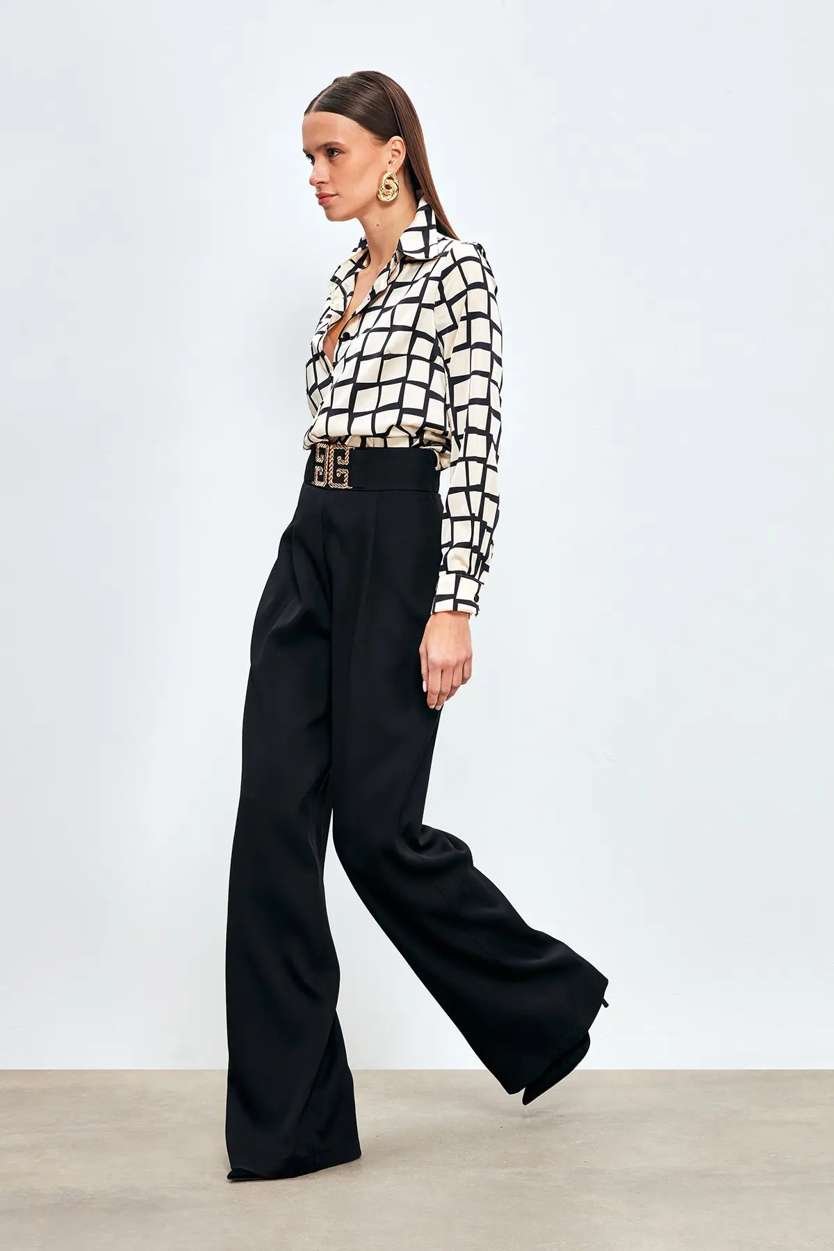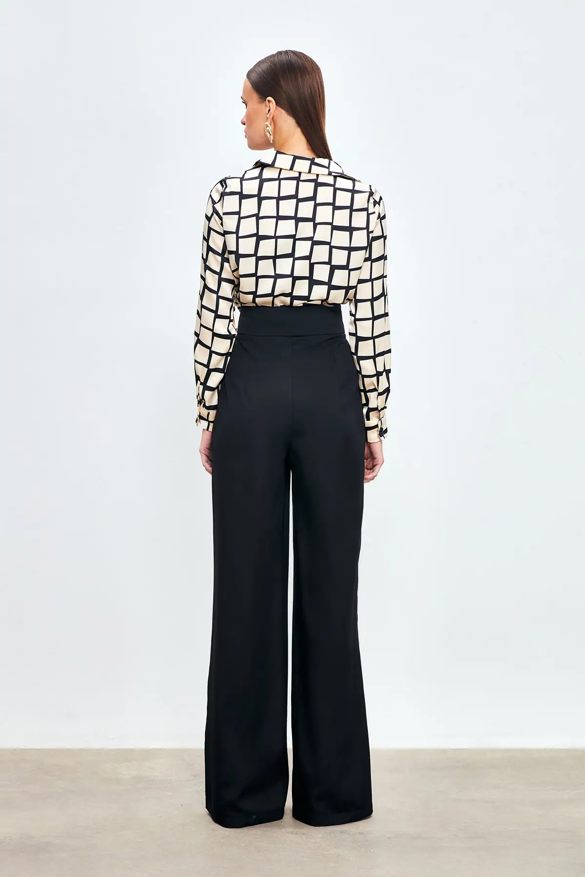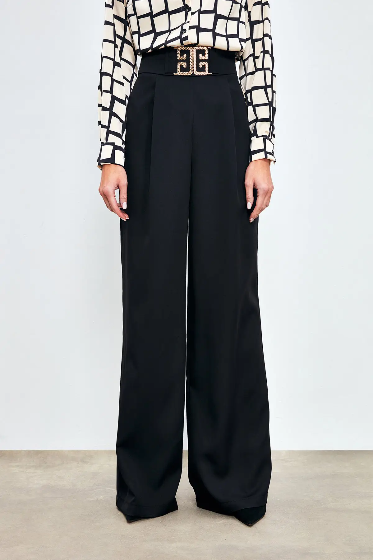 Αυτό το μαύρο παντελόνι με φαρδιά, ίσια γραμμή είναι το must-have κομμάτι που δεν πρέπει να λείπει από την ντουλάπα σου! Διαθέτει κανονική εφαρμογή που αγκαλιάζει τέλεια το σώμα και ένα κρυφό φερμουάρ στο πλάι για άψογη εφαρμογή και κομψότητα. Η χρυσή ατσάλινη αγκράφα στη ζώνη προσθέτει μια πινελιά πολυτέλειας που μαγνητίζει τα βλέμματα!