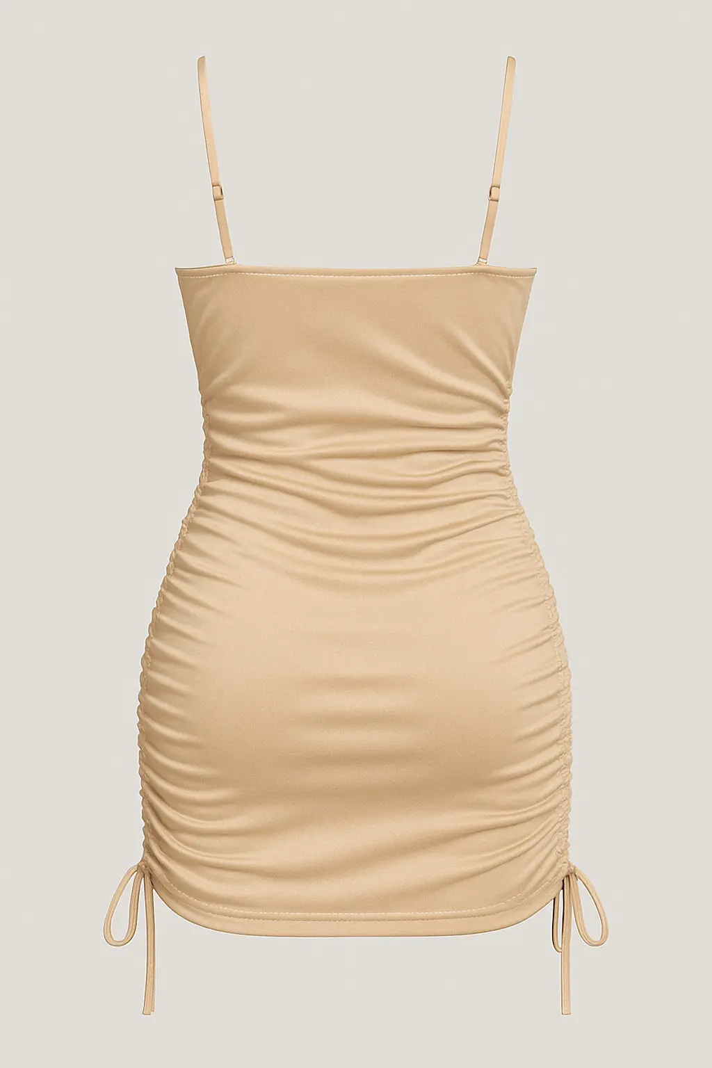 Εντυπωσιακό σατέν μίνι φόρεμα με λεπτές τιράντες και ανοιχτή πλάτη, σε κομψή μπεζ απόχρωση.
