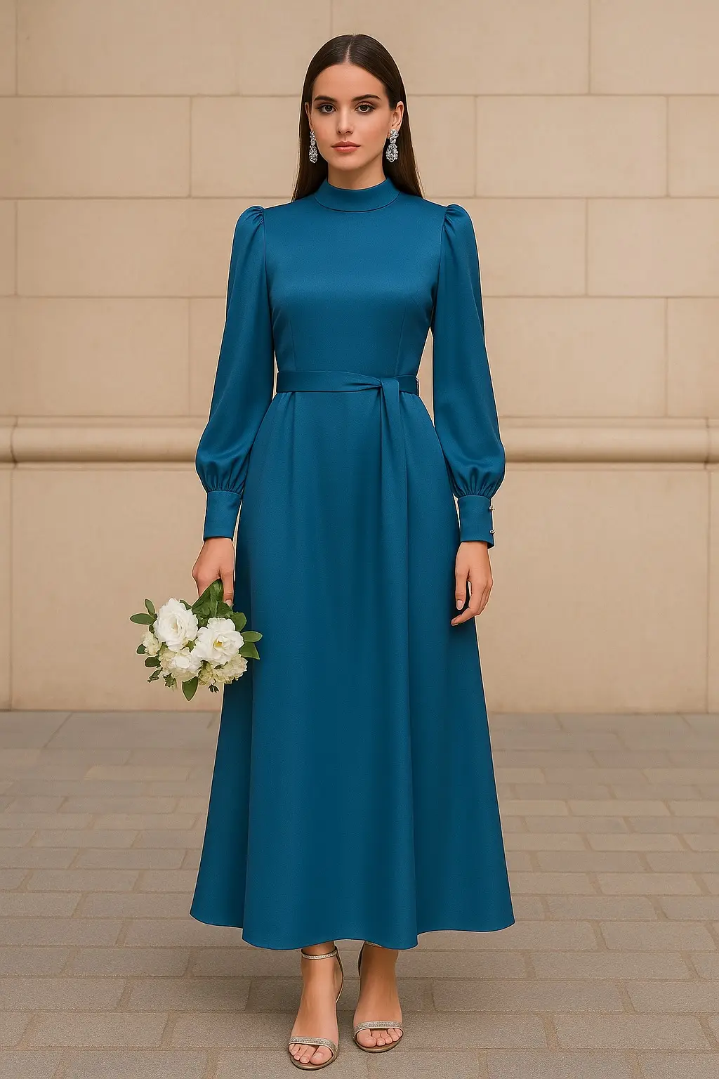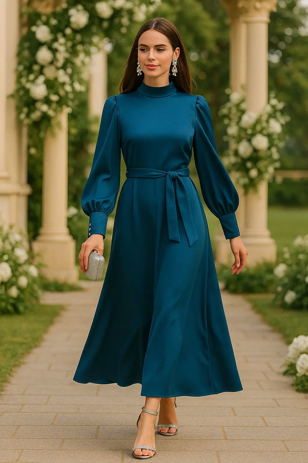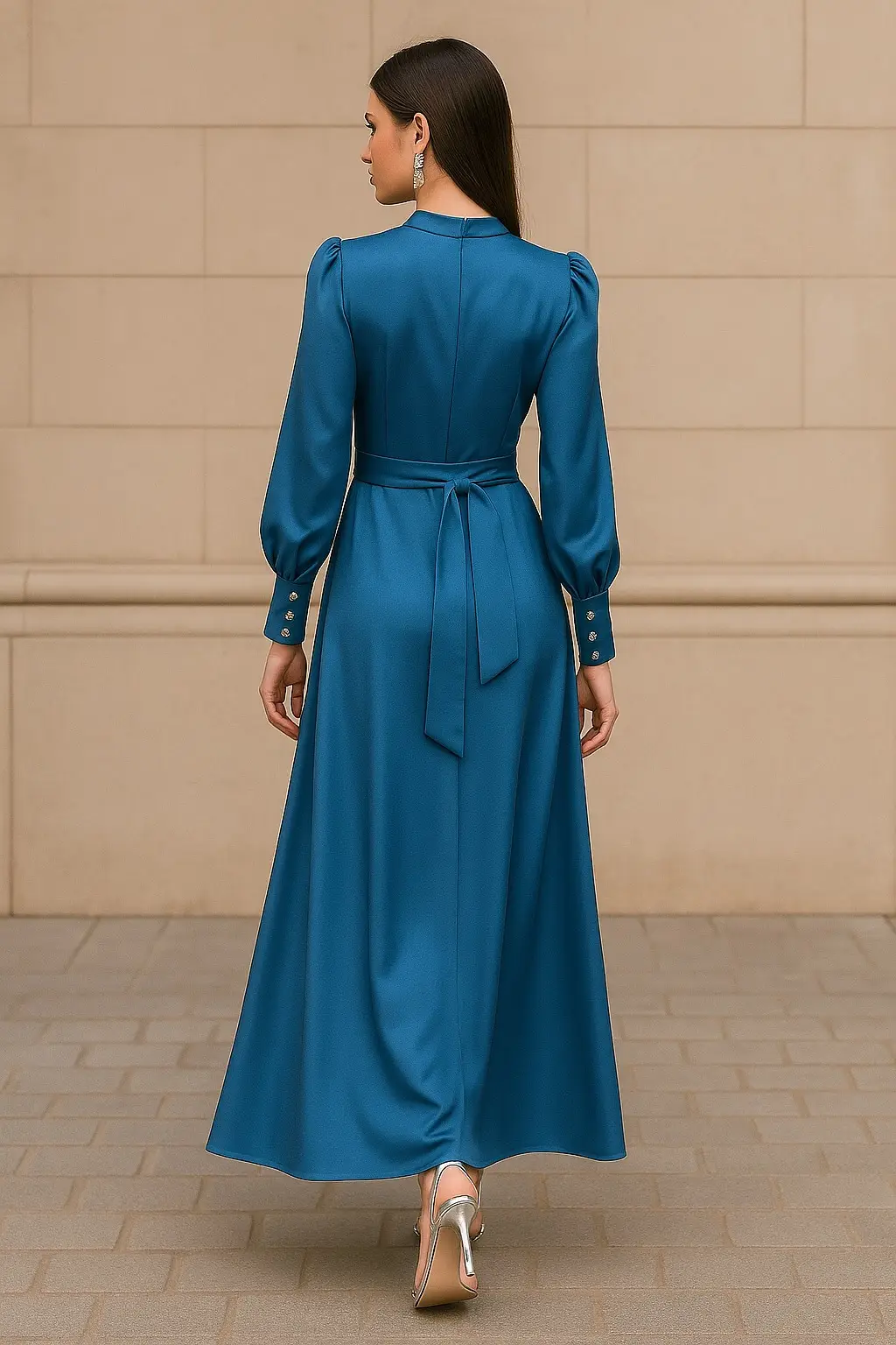 Γυναικείο σατέν φόρεμα σε γαλάζια απόχρωση, με φαρδιά, εντυπωσιακή γραμμή που προσφέρει άνεση και αριστοκρατική κίνηση. Τα μακριά μανίκια του διαθέτουν φαρδύ καπάκι, διακοσμημένο με 3 ασημένια κουμπιά που χαρίζουν διακριτική λάμψη και στυλ.