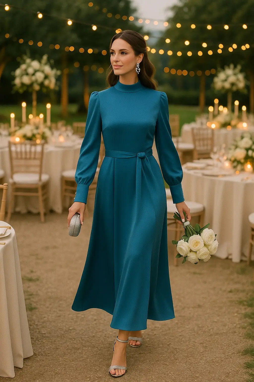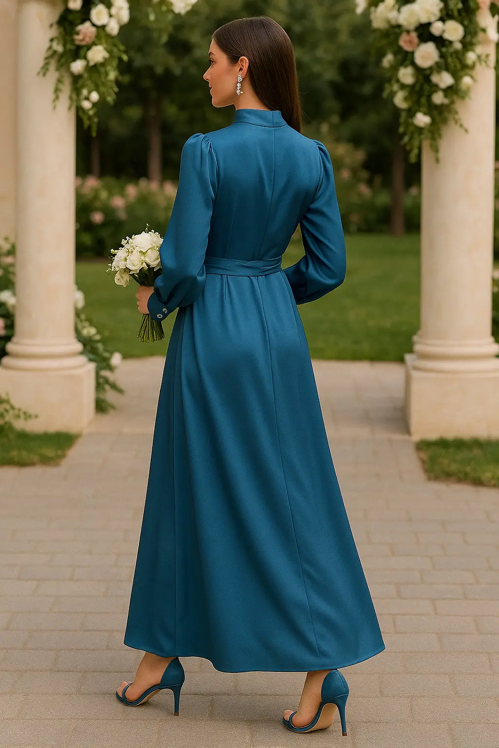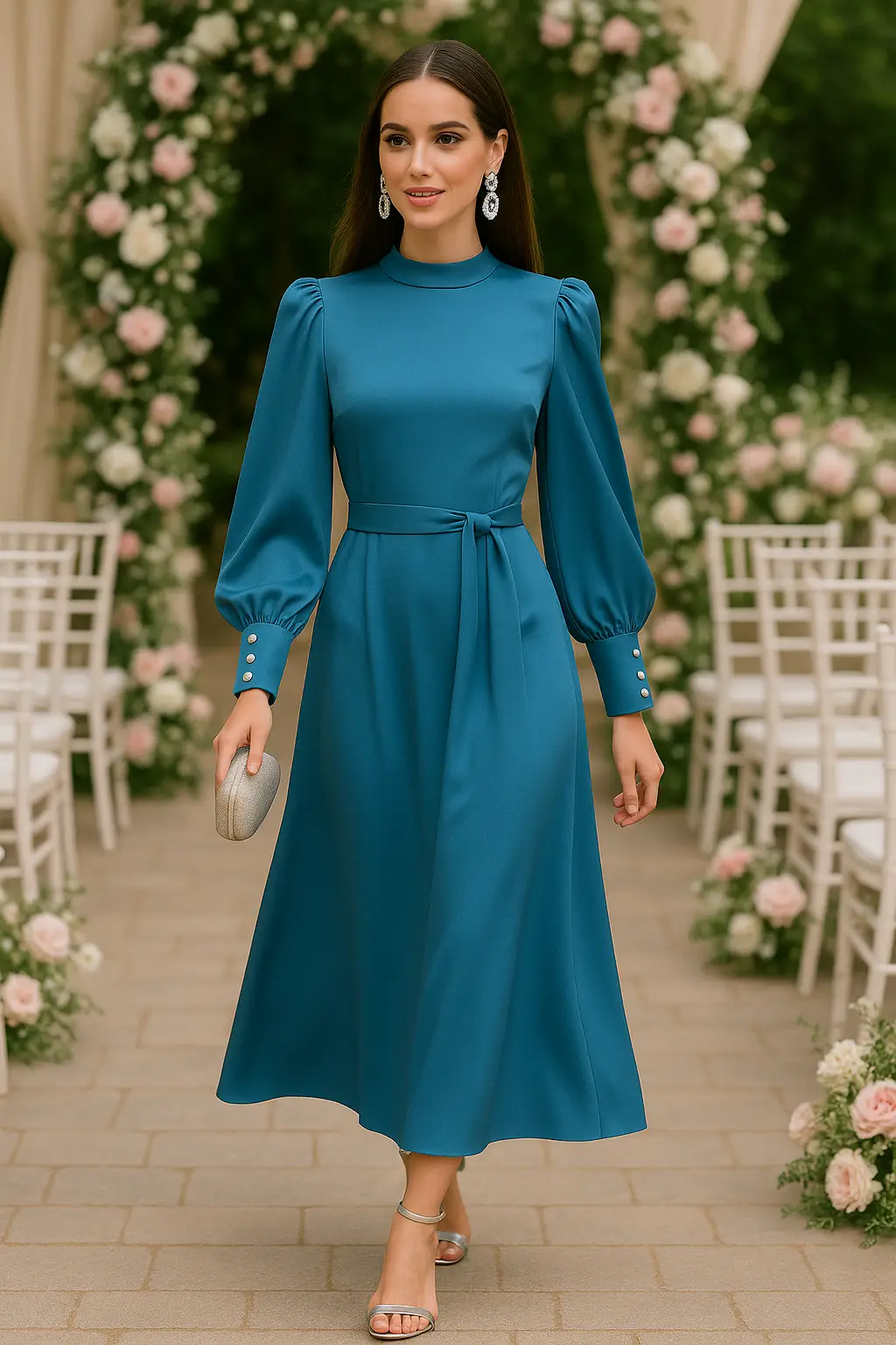 Γυναικείο σατέν φόρεμα σε γαλάζια απόχρωση, με φαρδιά, εντυπωσιακή γραμμή που προσφέρει άνεση και αριστοκρατική κίνηση. Τα μακριά μανίκια του διαθέτουν φαρδύ καπάκι, διακοσμημένο με 3 ασημένια κουμπιά που χαρίζουν διακριτική λάμψη και στυλ.