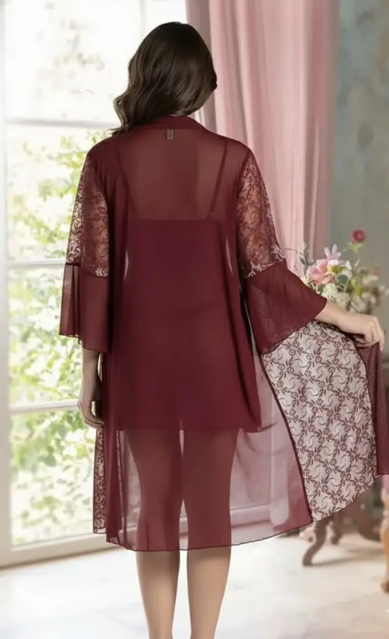 Γυναικείο σετ νυχτικού 3 τεμαχίων σε βαθύ μπορντό που αποπνέει πάθος και πολυτέλεια. Με εκλεπτυσμένο συνδυασμό σατέν, τούλι και φίνας δαντέλας, σχεδιασμένο για να αναδείξει τη γυναικεία σιλουέτα με τρόπο που μαγνητίζει τα βλέμματα. Το απόλυτο must-have για εντυπωσιακές εμφανίσεις μέσα στο σπίτι.