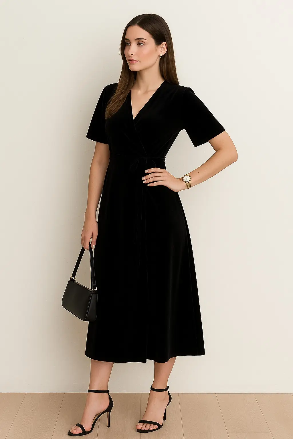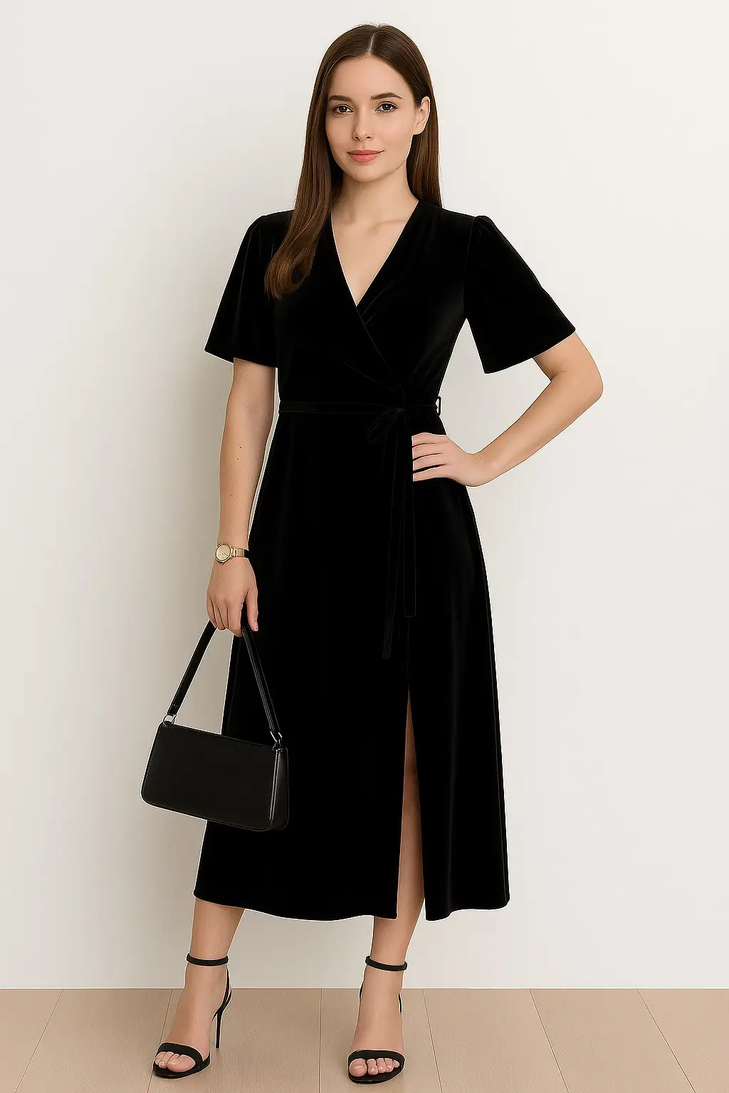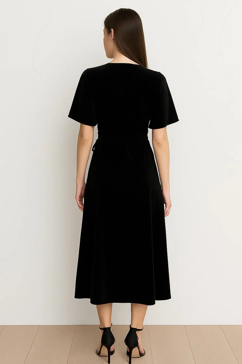 Το Μακρύ Βελουτέ Φόρεμα σε Μαύρο χρώμα αναδεικνύει την απόλυτη συνύπαρξη μεταξύ κομψότητας και άνεσης. Κατασκευασμένο από υψηλής ποιότητας 100% polyester, αυτό το φόρεμα προσφέρει απαλή υφή που αγκαλιάζει το σώμα με κομψότητα.