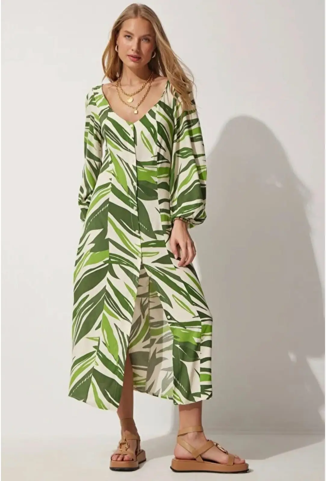 Αυτό το γυναικείο φόρεμα σε εκρού χρώμα με πράσινα σχήματα είναι μια εκπληκτική επιλογή για κάθε περίσταση. Ο στρόγγυλος ντεκολτέ και τα κουμπιά στο μπροστινό μέρος προσθέτουν μια διακριτική πινελιά στο στυλ σας.