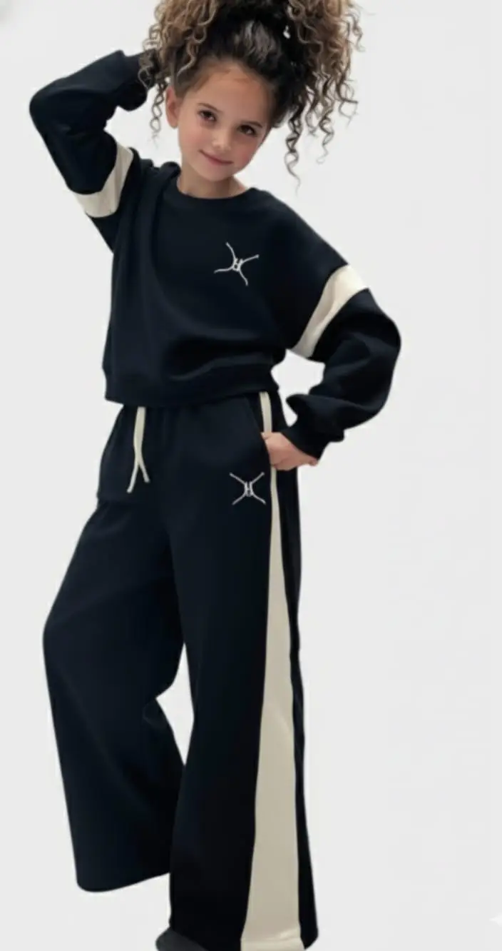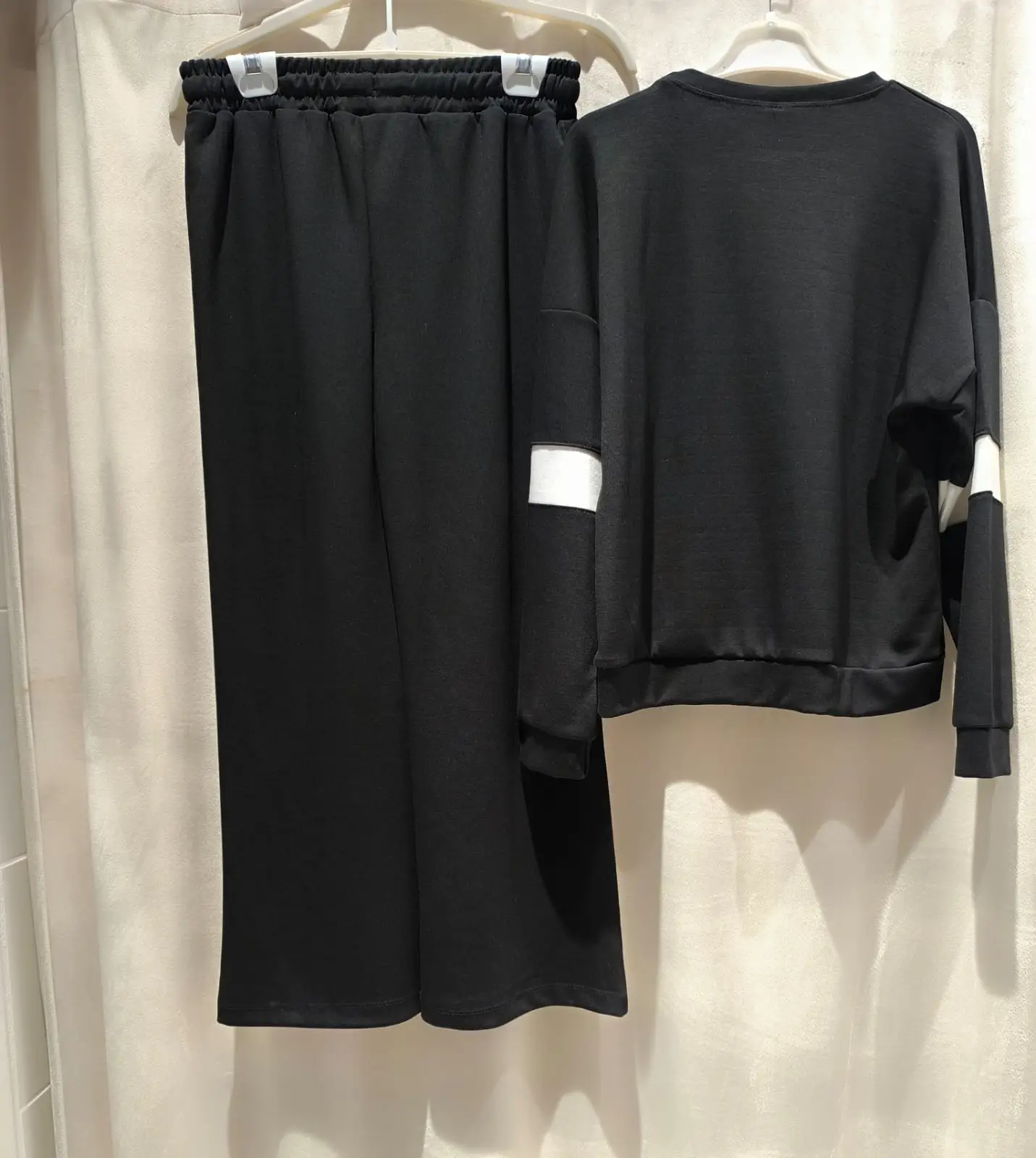 Άνετο και ποιοτικό σετ με μπλούζα και παντελόνι σε μαύρο χρώμα. Η μπλούζα έχει στρογγυλή λαιμόκοψη, κεντημένη στάμπα στο στήθος και λευκές λεπτομέρειες στα μανίκια με λάστιχο στα τελειώματα. Το παντελόνι διαθέτει φαρδιά, ίσια γραμμή με λευκές ρίγες στα πλάγια, δύο τσέπες μπροστά, κεντημένη μικρή στάμπα στο πλάι και φαρδύ λάστιχο με κορδόνι στη μέση.