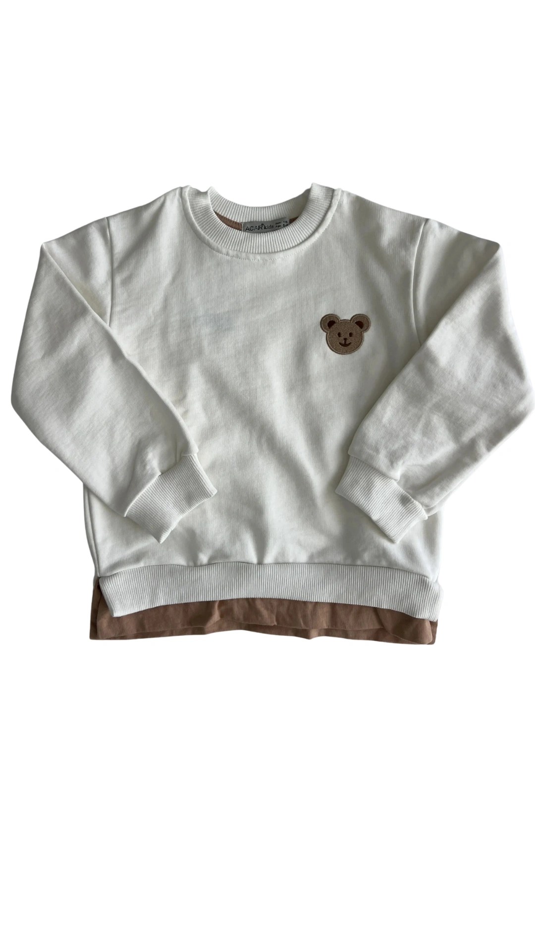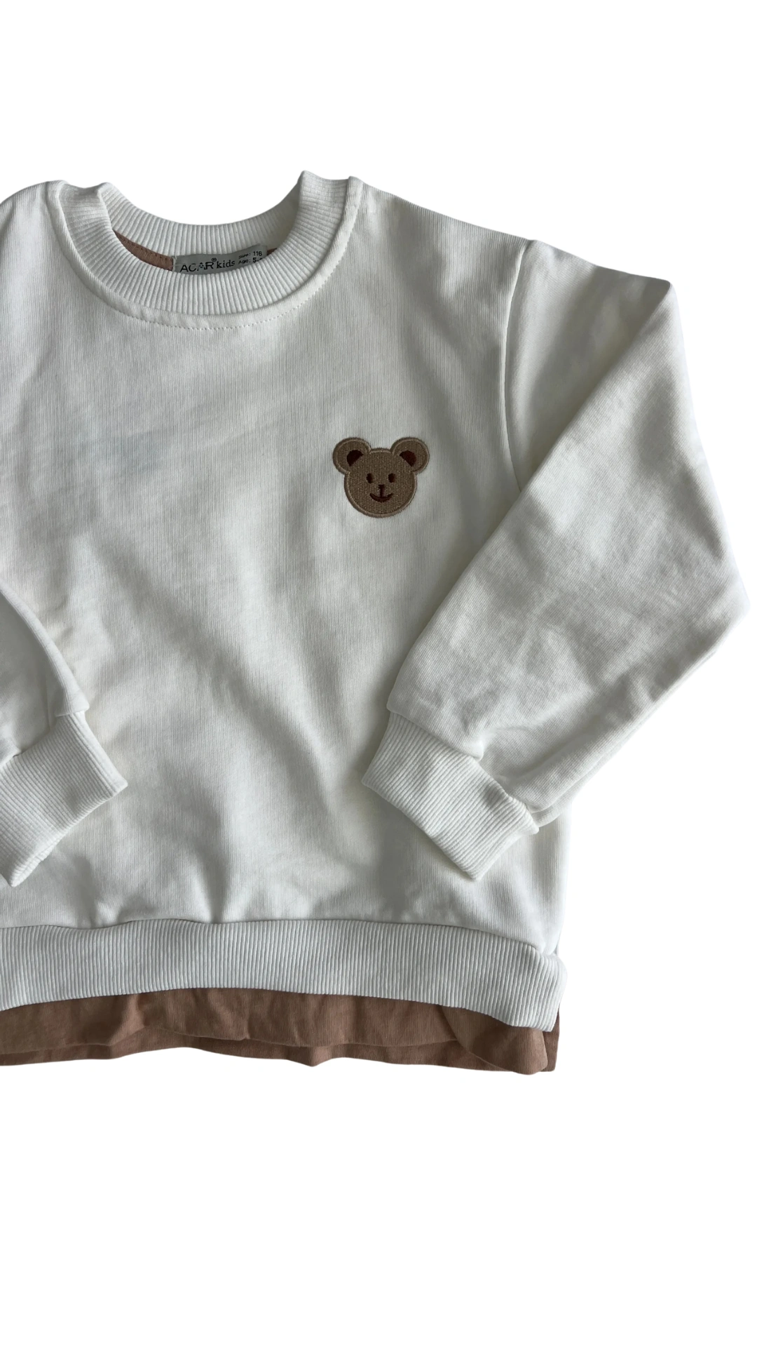 Η μπλούζα προσδίδει εξαιρετική φινέτσα με τα μακριά μανίκια και το υφασμάτινο καφέ τελείωμα για μια μοναδική διακοσμητική πινελιά. Το διακοσμητικό αρκουδάκι στο πάνω μέρος προσθέτει χαρά και παιχνιδιάρικο ύφος.
